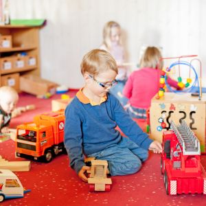Eine Spielecke am Boden mit Duplo-Steinen und Holzbausteinen, eine Puppenecke und Sitzgelegenheiten zum Basteln und Malen, Bilderbücher, Puzzles, …